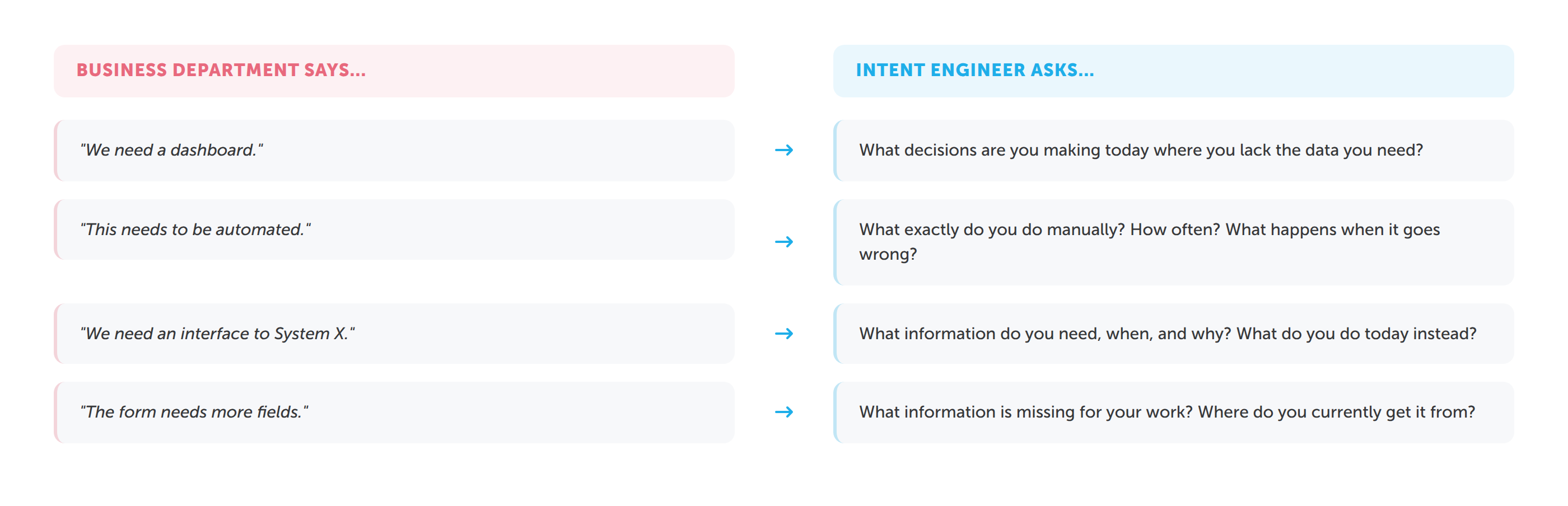When someone says "We need a dashboard," the Intent Engineer asks: "What decisions are you making today where you lack the data?" When someone says "This needs to be automated," the response is: "What exactly do you do manually? How often? What happens when it goes wrong?" When someone says "We need an interface to System X," the question is: "What information do you need, when, and why from System X? What do you do today instead?"