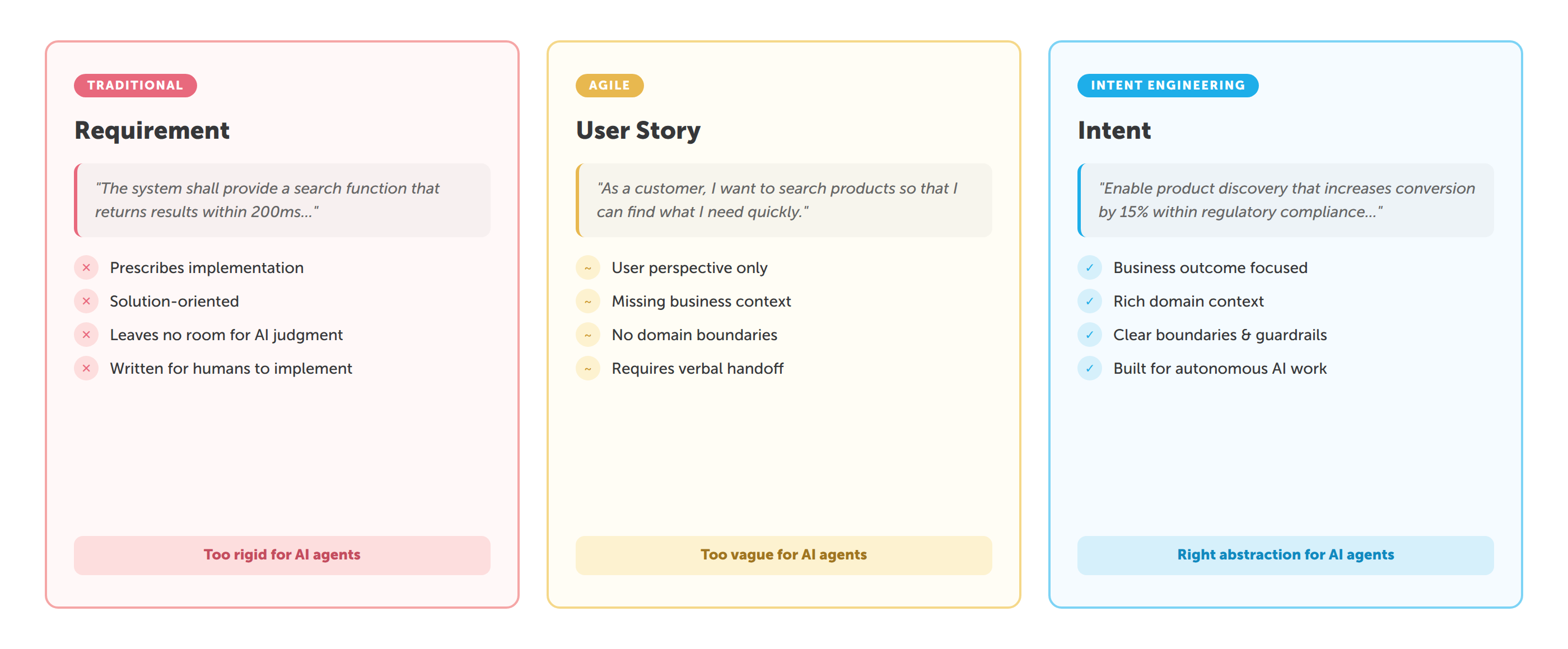 This is the core insight: AI agents don't need more precise instructions. They need more context and more freedom. Requirements over-constrain the solution space. User stories under-specify the problem space. Intent hits the sweet spot, it's precise about the what and why, but deliberately open about the how.