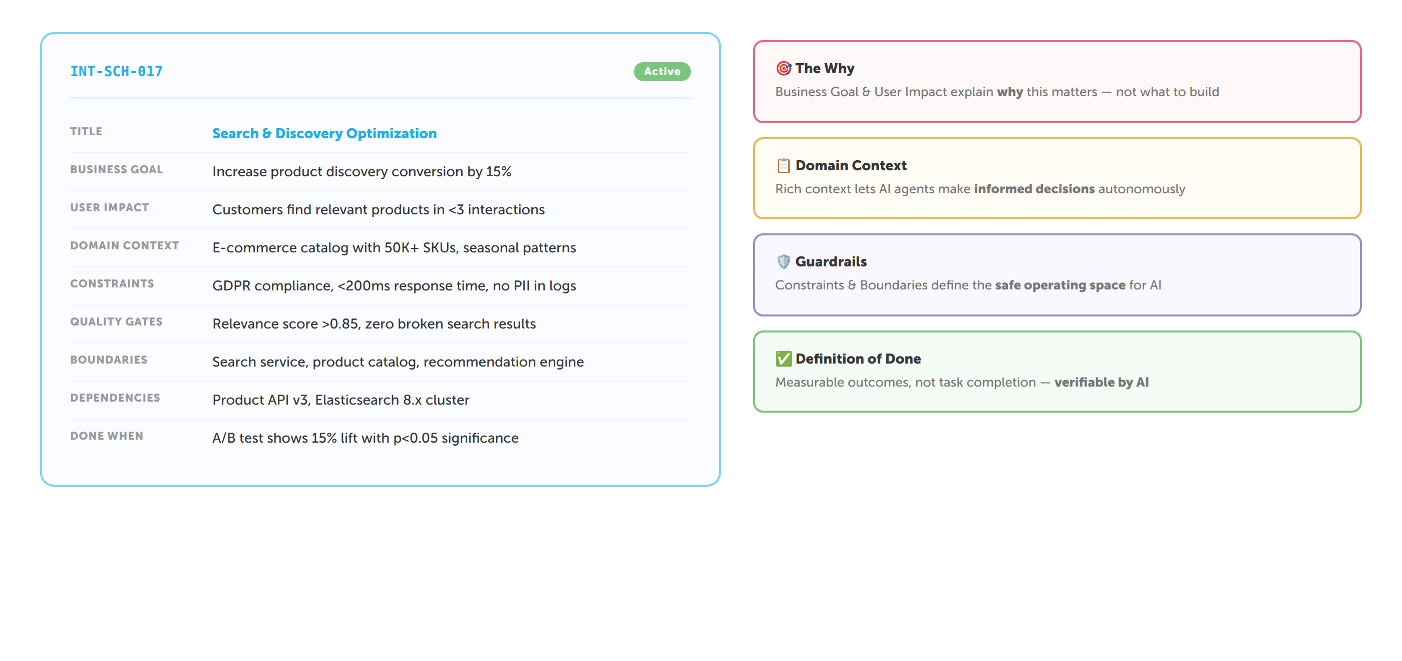 AI agents amplify this problem dramatically. A human developer can compensate for a vague requirement, they'll walk over to the product owner's desk and ask. An AI agent can't. Give it an ambiguous instruction, and it will confidently build exactly the wrong thing.